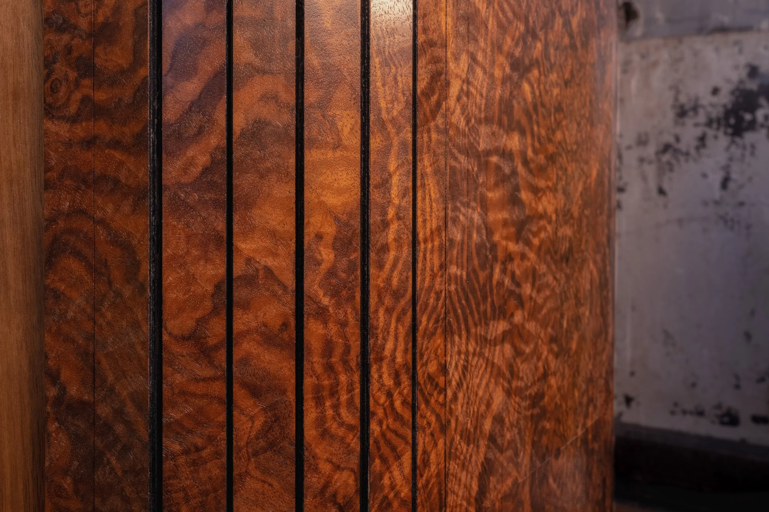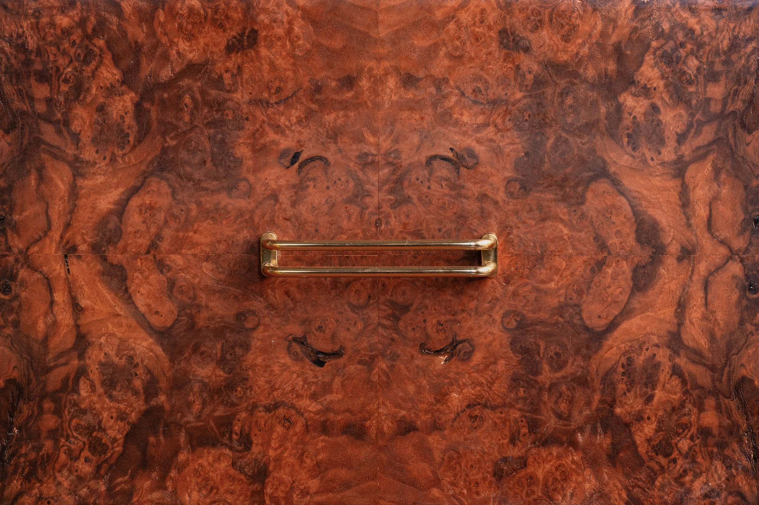 Light was approached with similar restraint. The single window source created direction and inconsistency, particularly across the burl surfaces. Multiple exposures were captured and blended to retain detail across highlights and shadows, allowing the material to read with depth while remaining cohesive across the entire piece. Particular attention was given to how the burl was rendered, including the continuity and symmetry created through bookmatching across the doors. The lighting needed to support that structure, not compete with it.