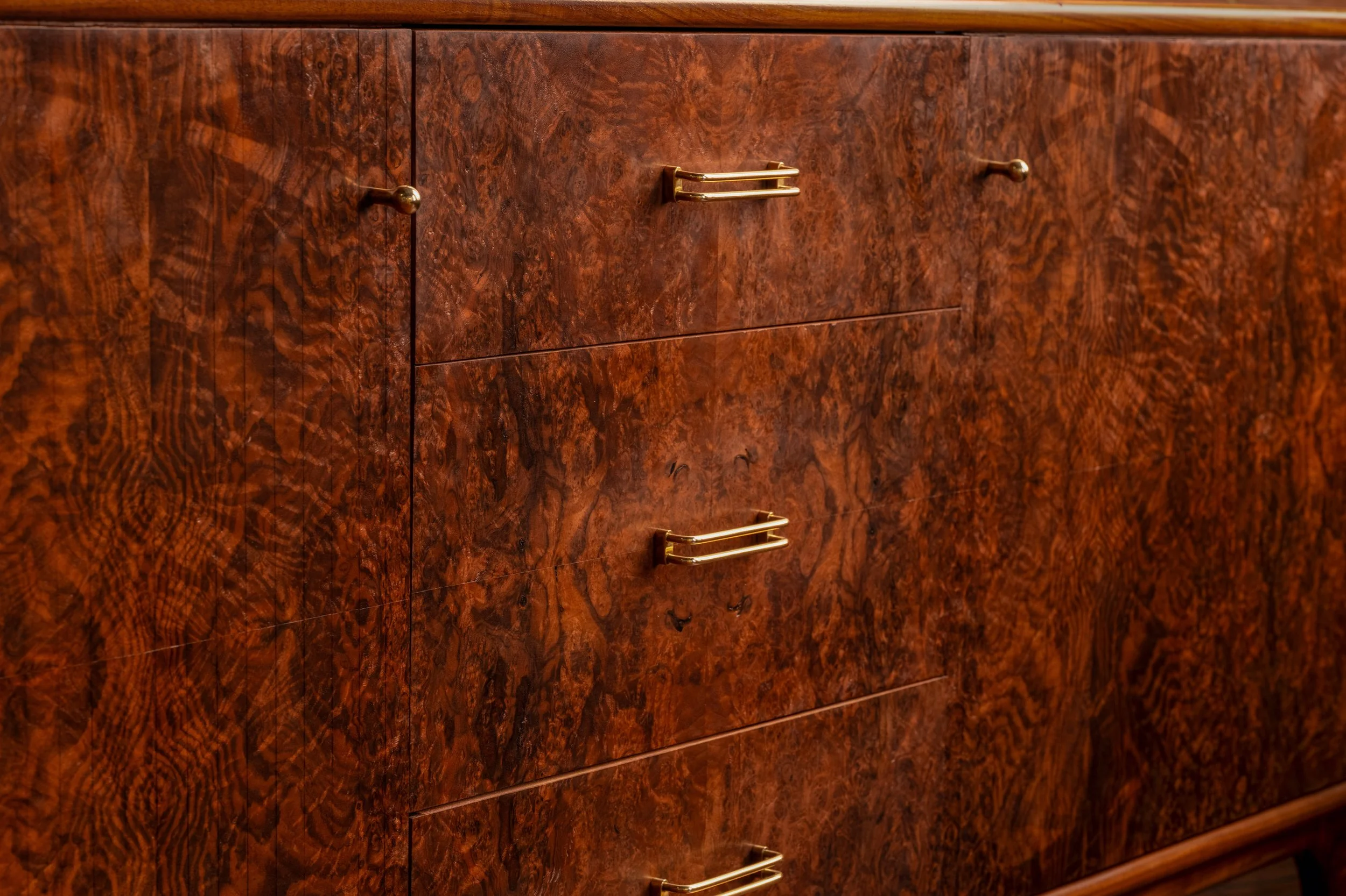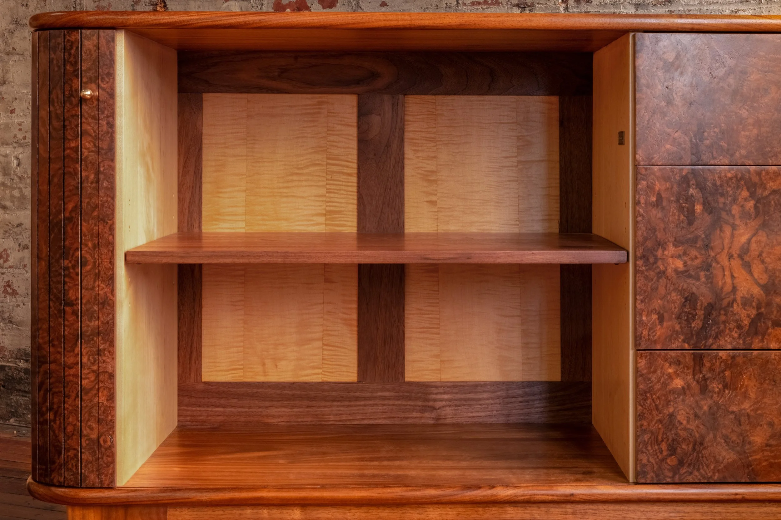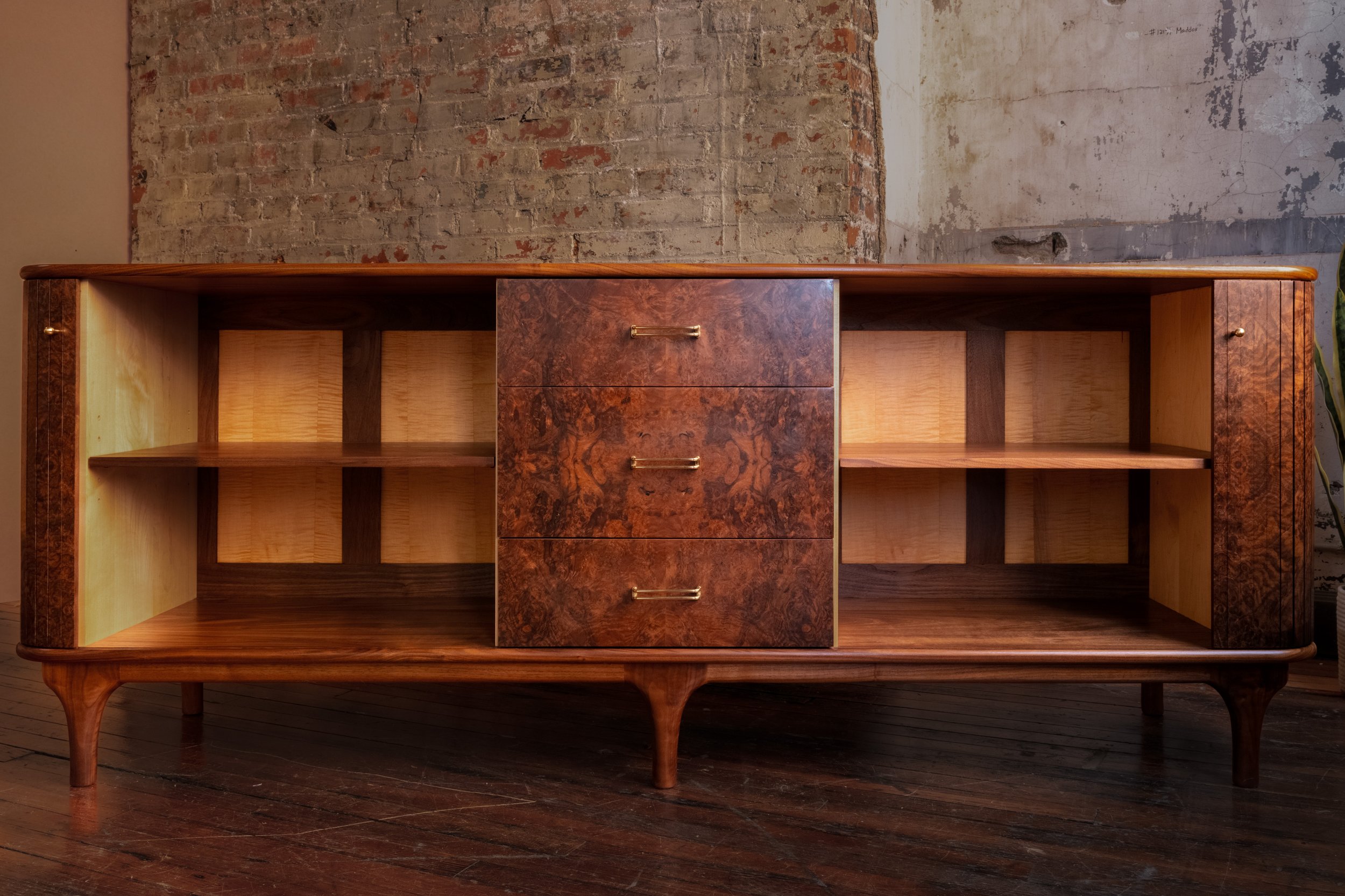 The credenza is constructed primarily from solid walnut, with a walnut burl veneer across the primary surfaces. The burl introduces a level of visual complexity that is difficult to control under inconsistent light, with swirling grain patterns and tonal variation that shift depending on how they are lit. The interior is built from maple for stability, with curly maple drawer boxes joined with hand-cut dovetails. Brass hardware and tapered legs introduce a subtle mid-century influence, while the tambour doors slide cleanly into the body of the piece, requiring tight tolerances and careful execution to function without interruption.
