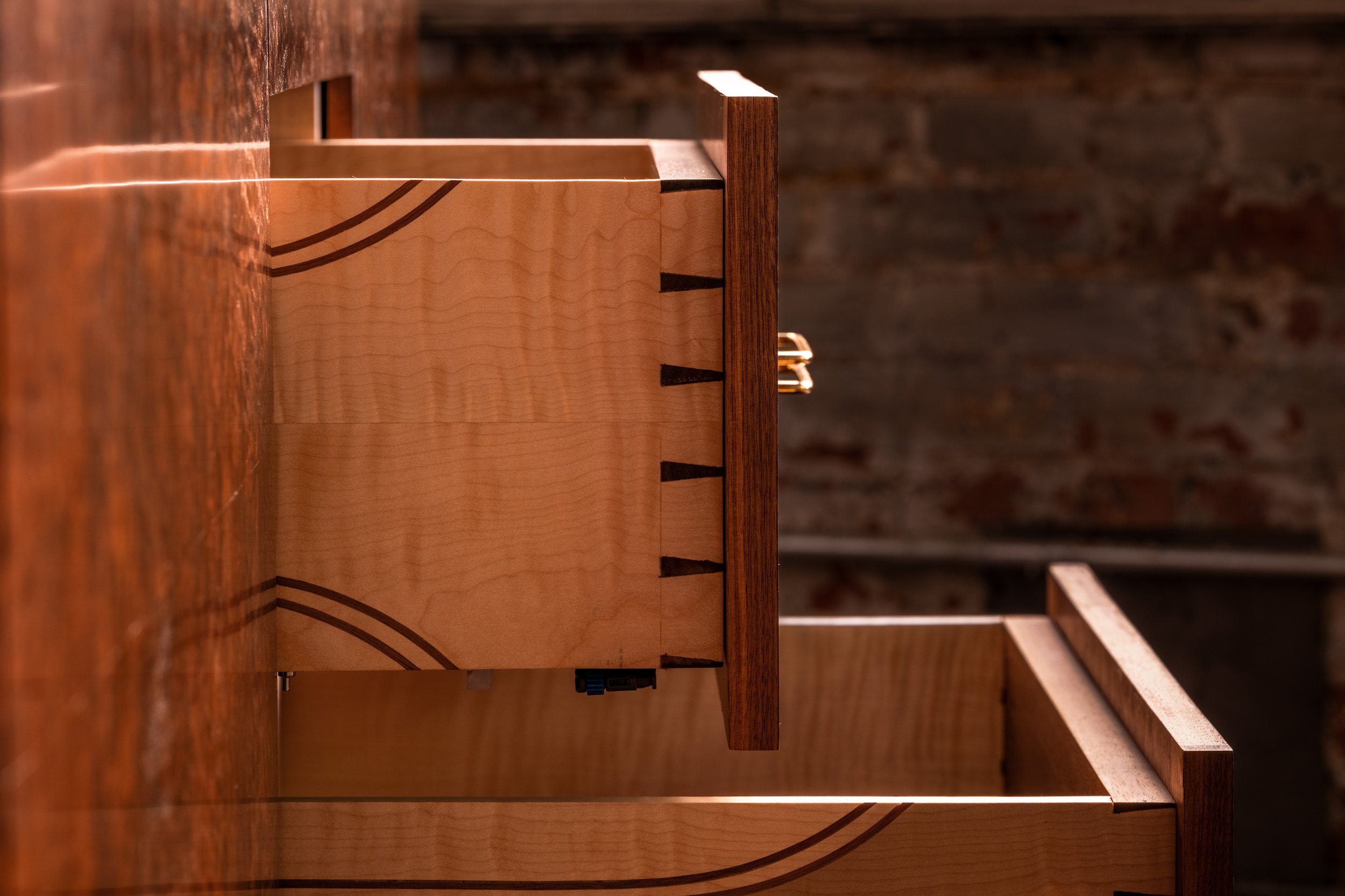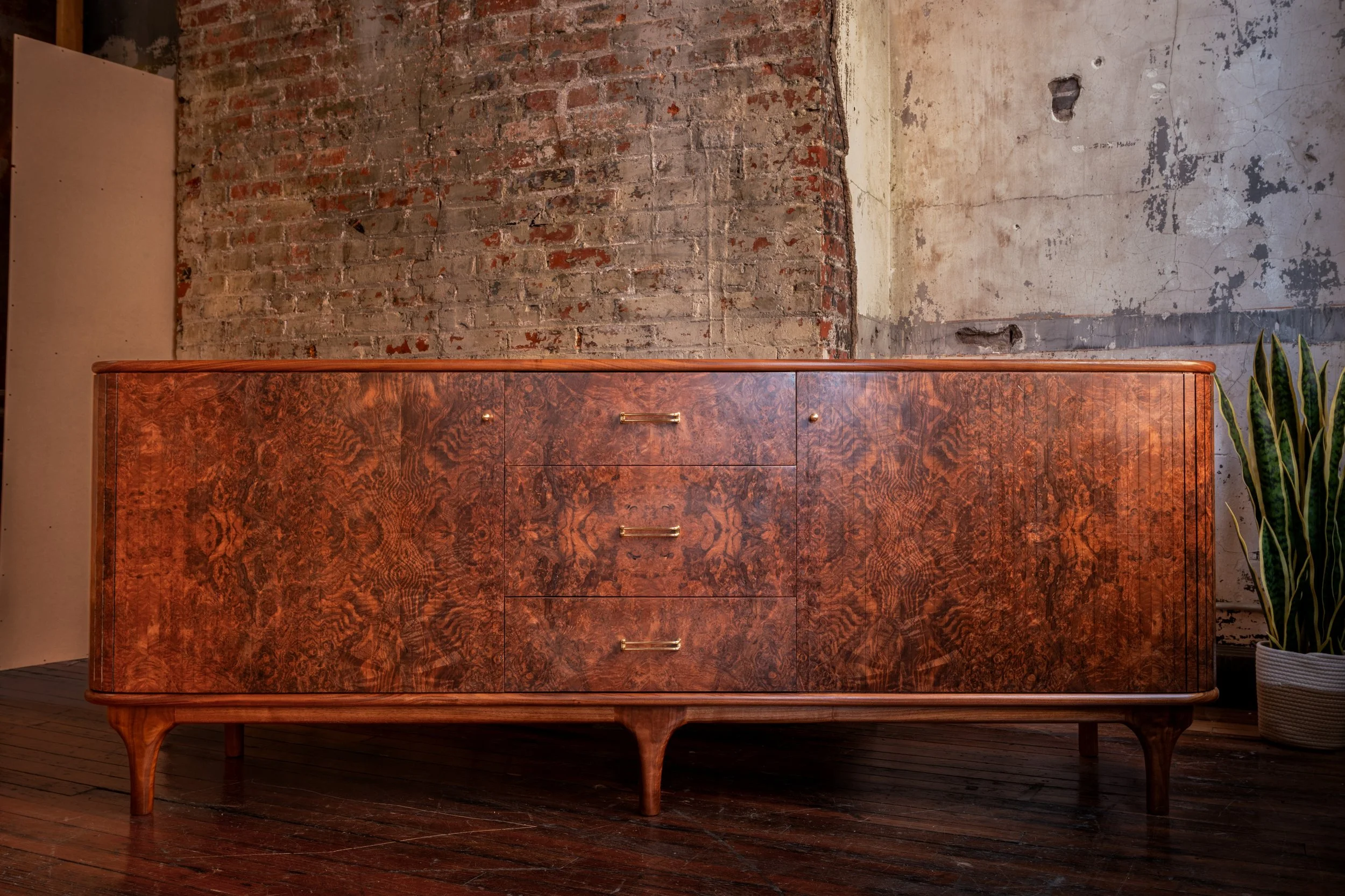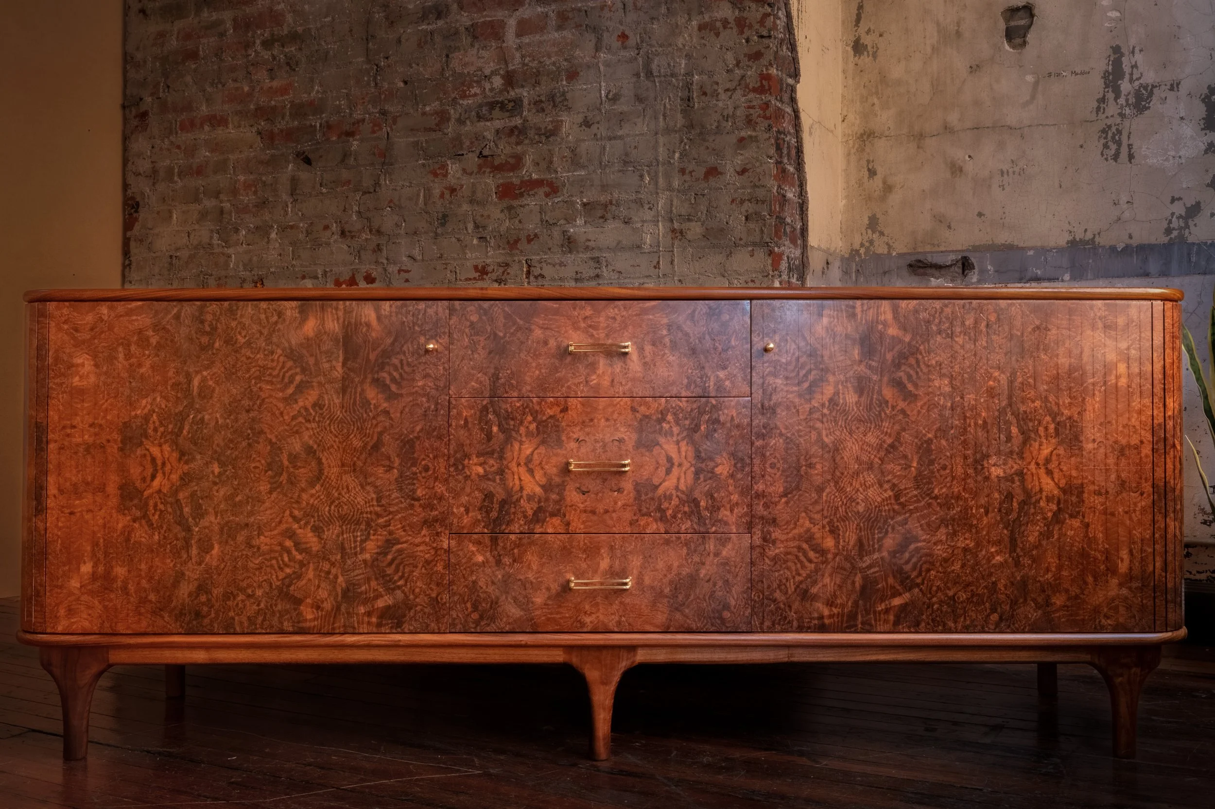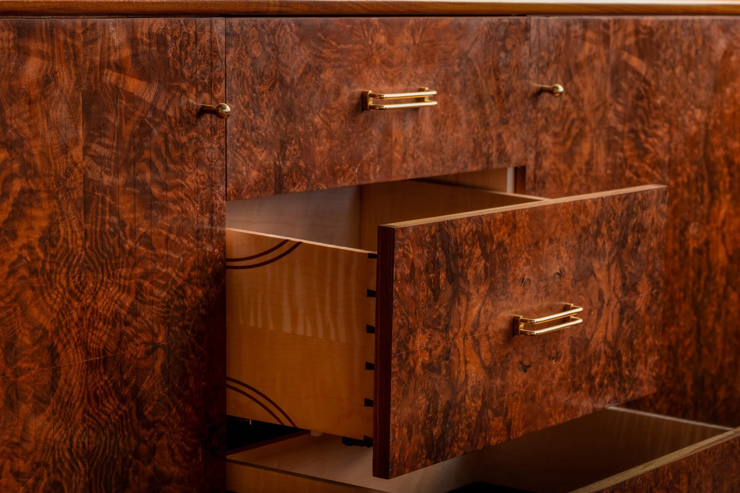 The credenza is constructed primarily from solid walnut, with a walnut burl veneer across the primary surfaces. The burl introduces a level of visual complexity that is difficult to control under inconsistent light, with swirling grain patterns and tonal variation that shift depending on how they are lit. The interior is built from maple for stability, with curly maple drawer boxes joined with hand-cut dovetails. Brass hardware and tapered legs introduce a subtle mid-century influence, while the tambour doors slide cleanly into the body of the piece, requiring tight tolerances and careful execution to function without interruption.